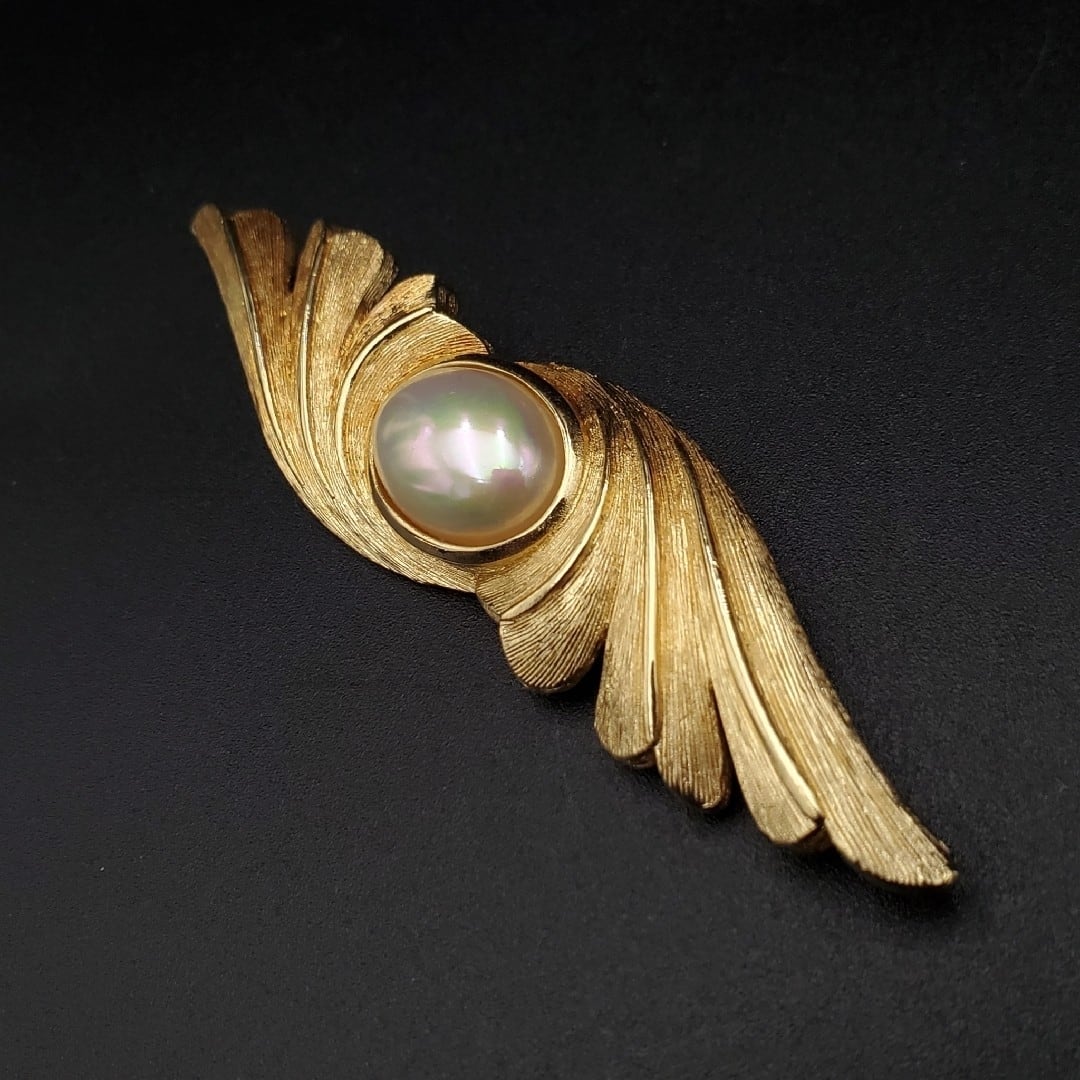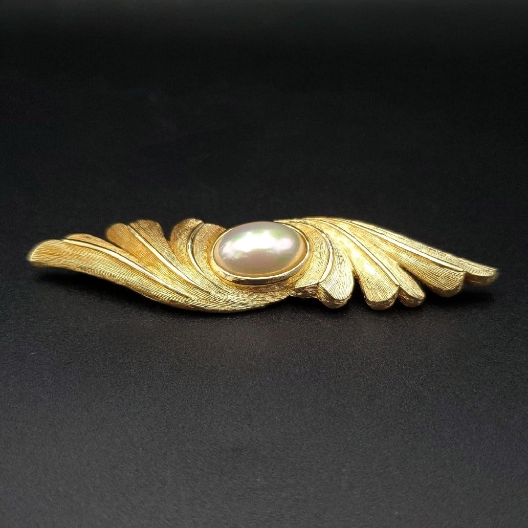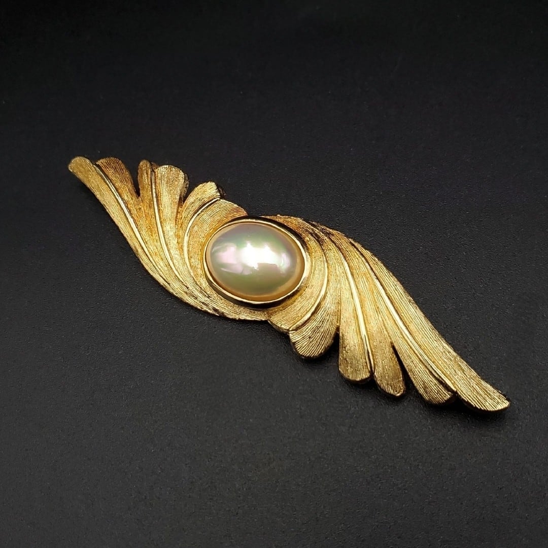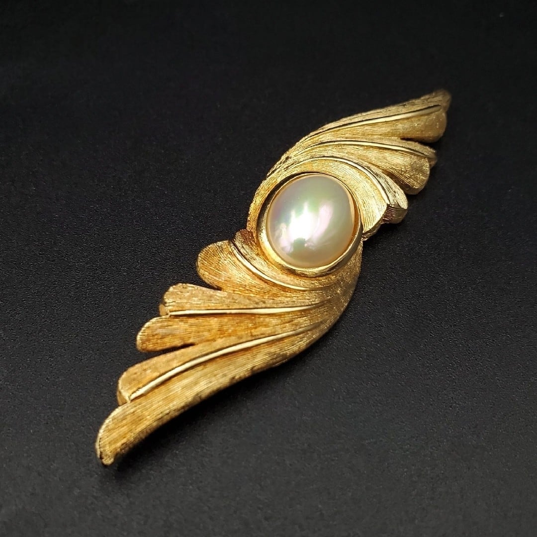 美品 Christian Dior クリスチャンディオール ブローチ フェイクパール 羽モチーフ ゴールドカラー Germany製 ドイツ製 80s 90s 刻印 ヴィンテージ オールド ギフト プレゼント 贈り物